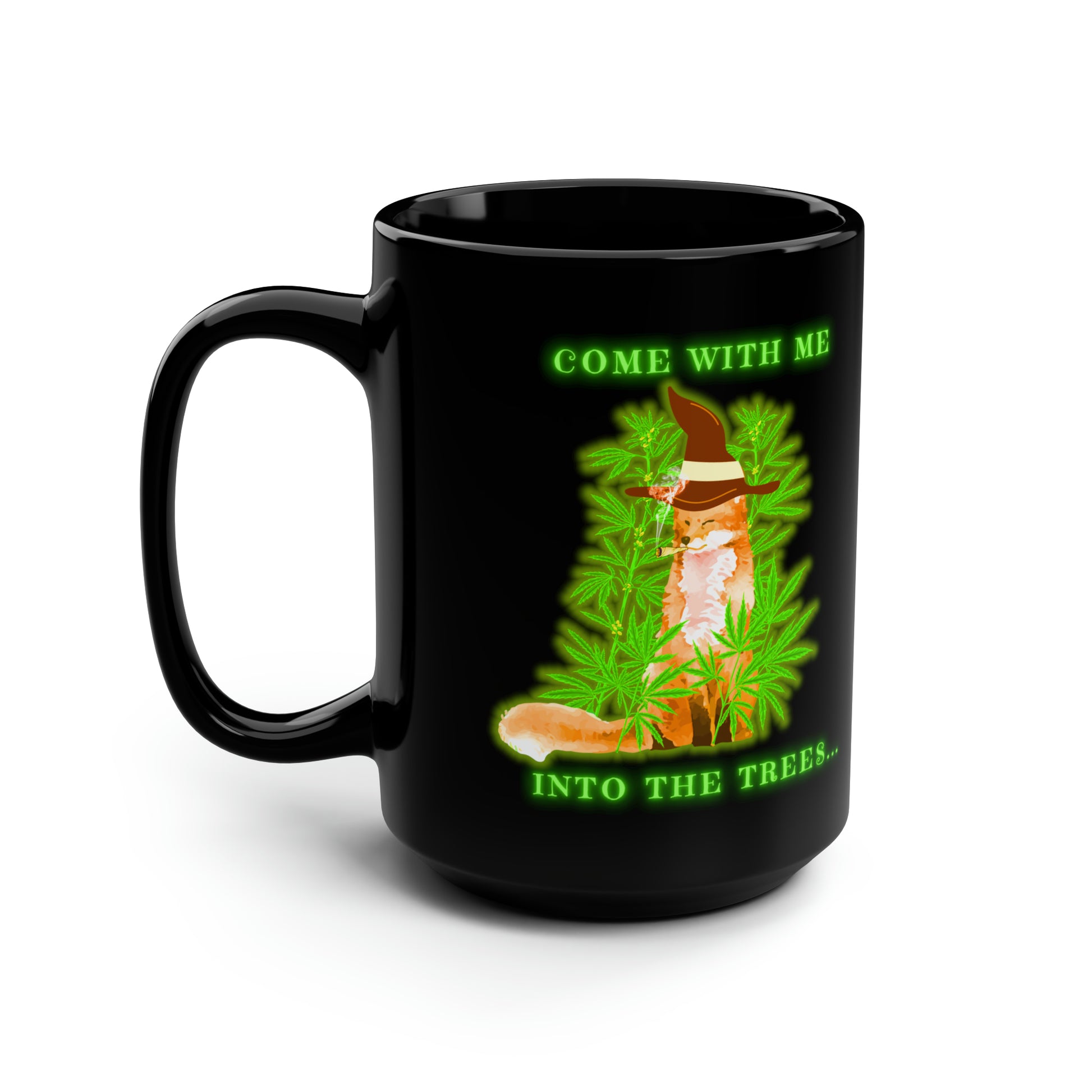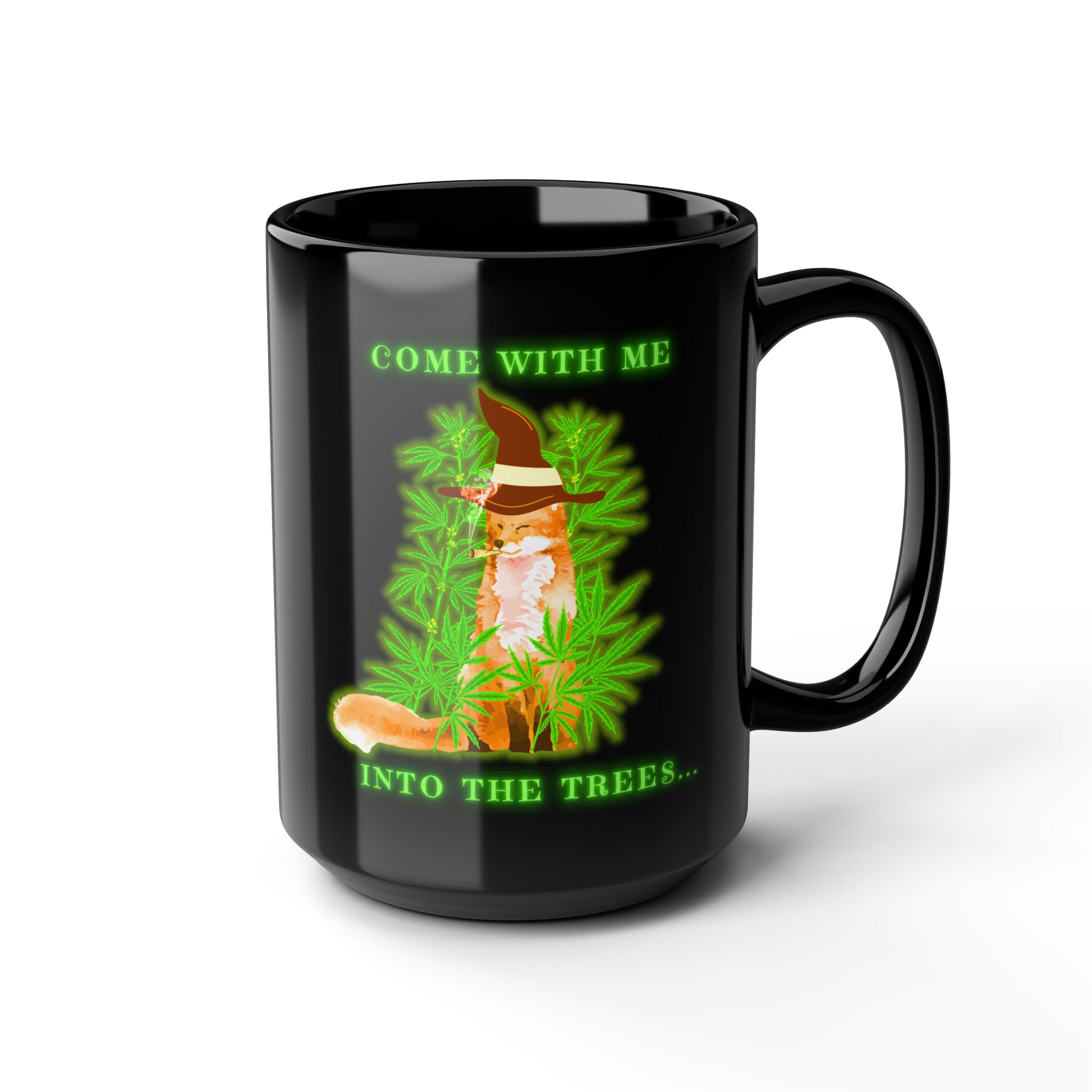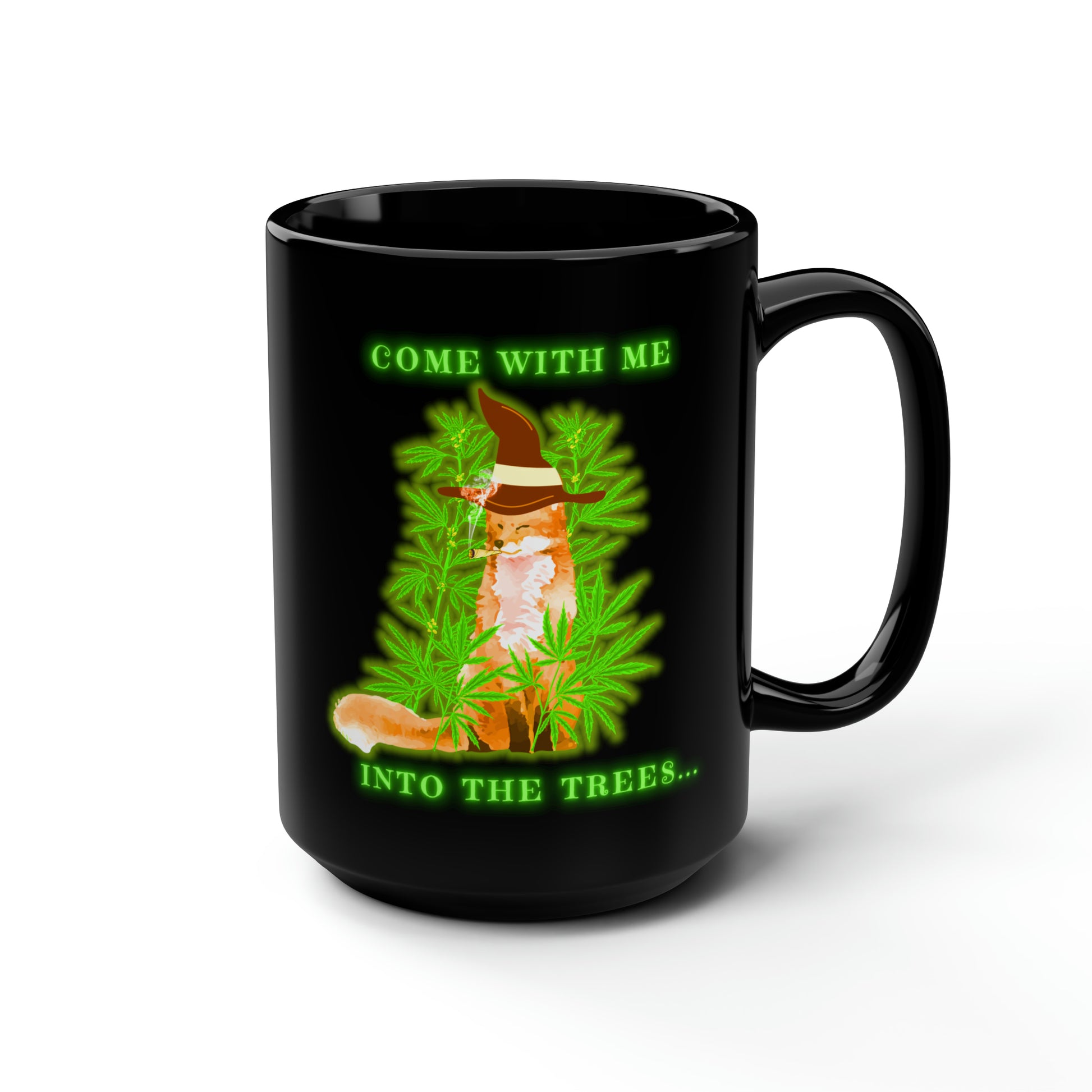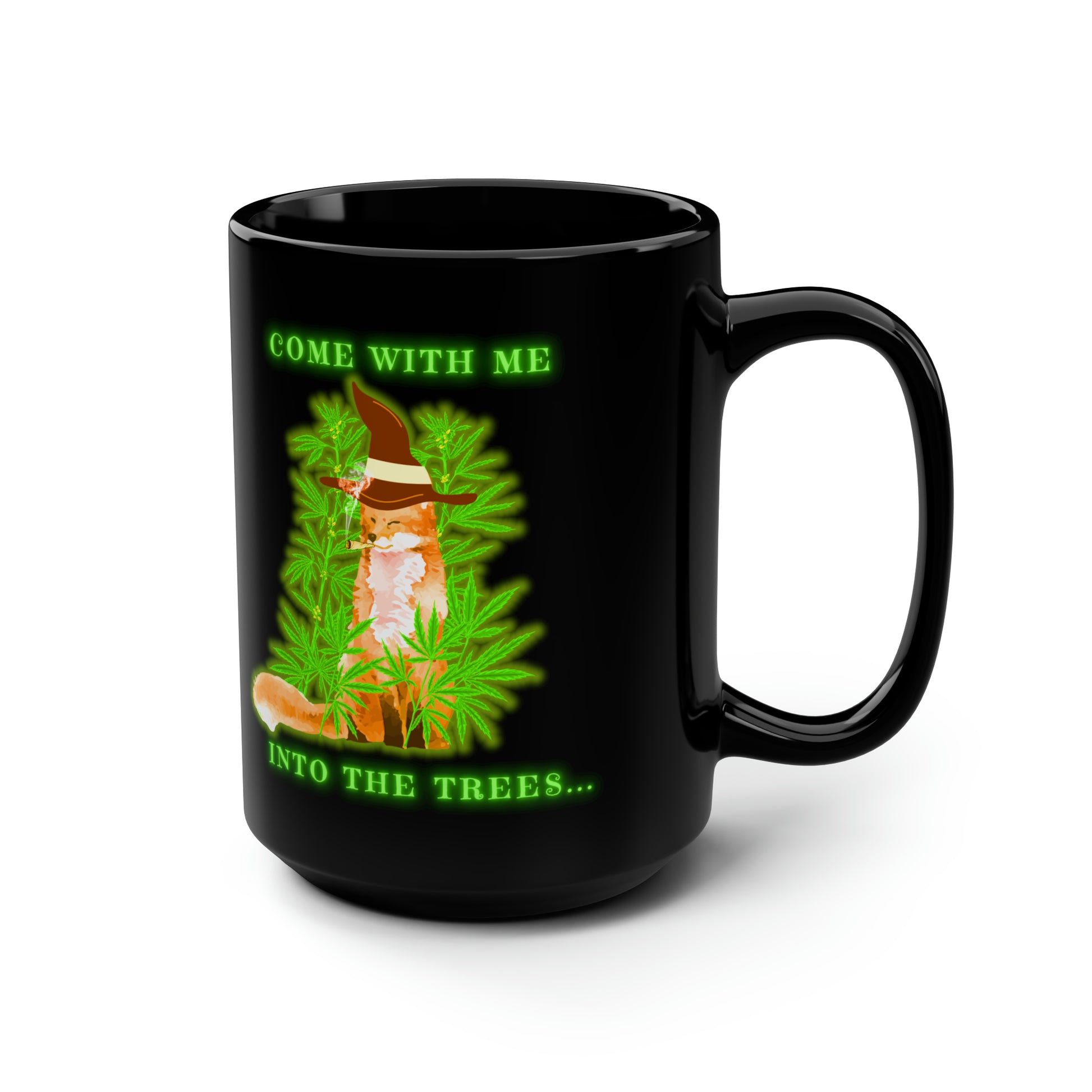 420 Fox, Into The Trees, Black Mug, 15oz, 420 Gift