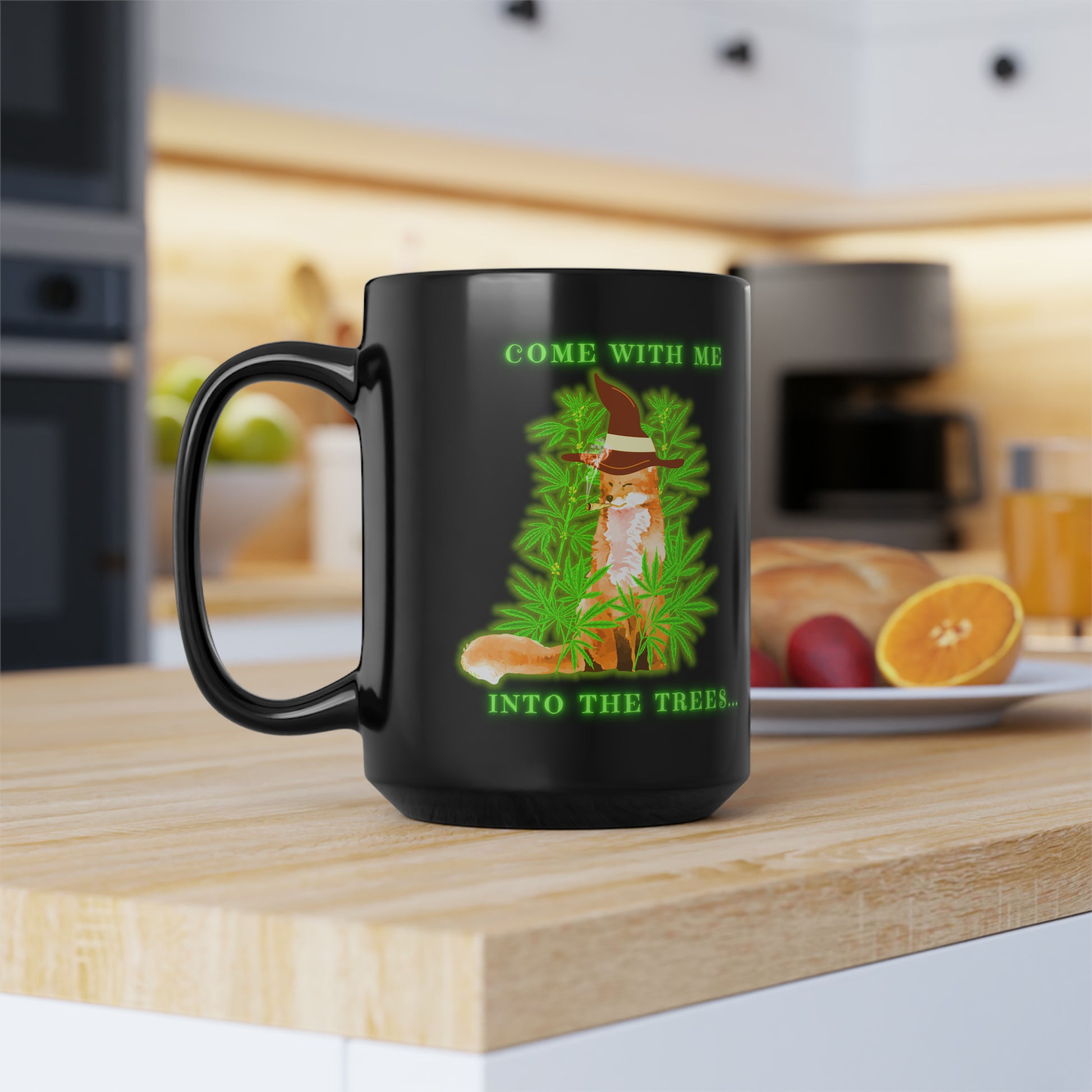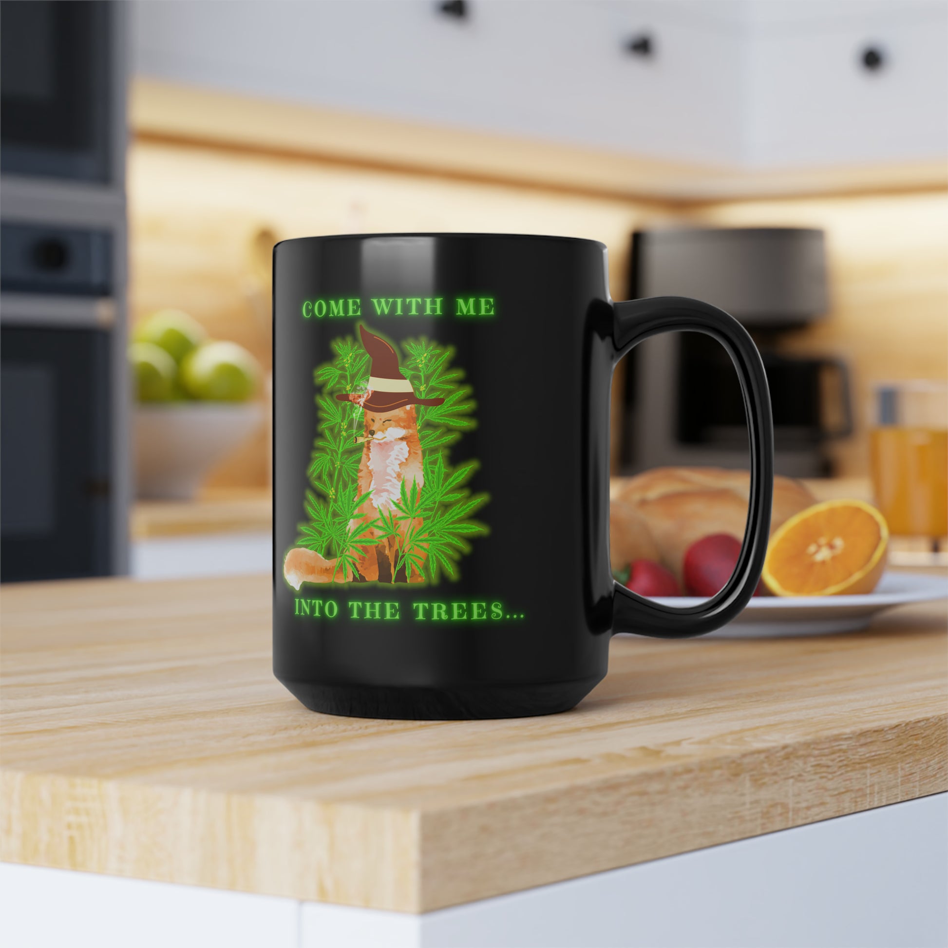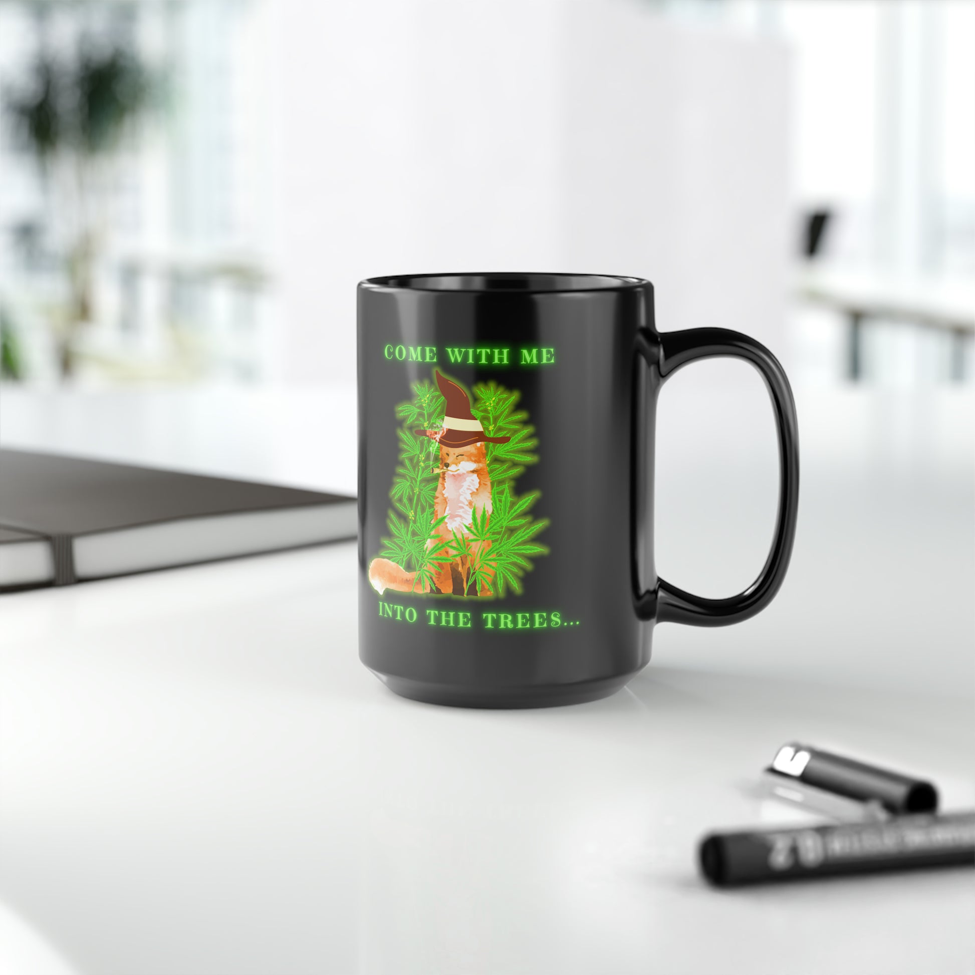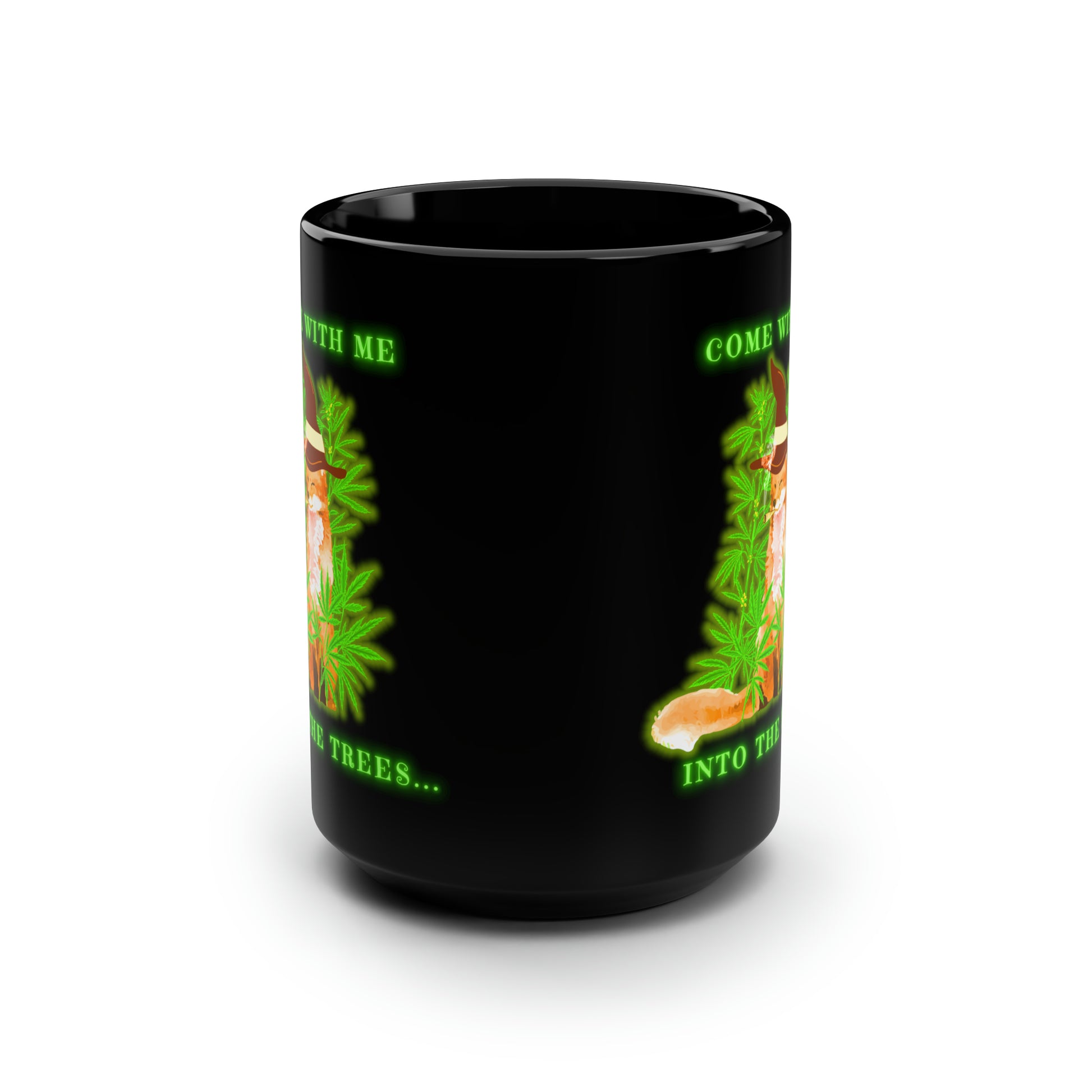 420 Fox, Into The Trees, Black Mug, 15oz, 420 Gift