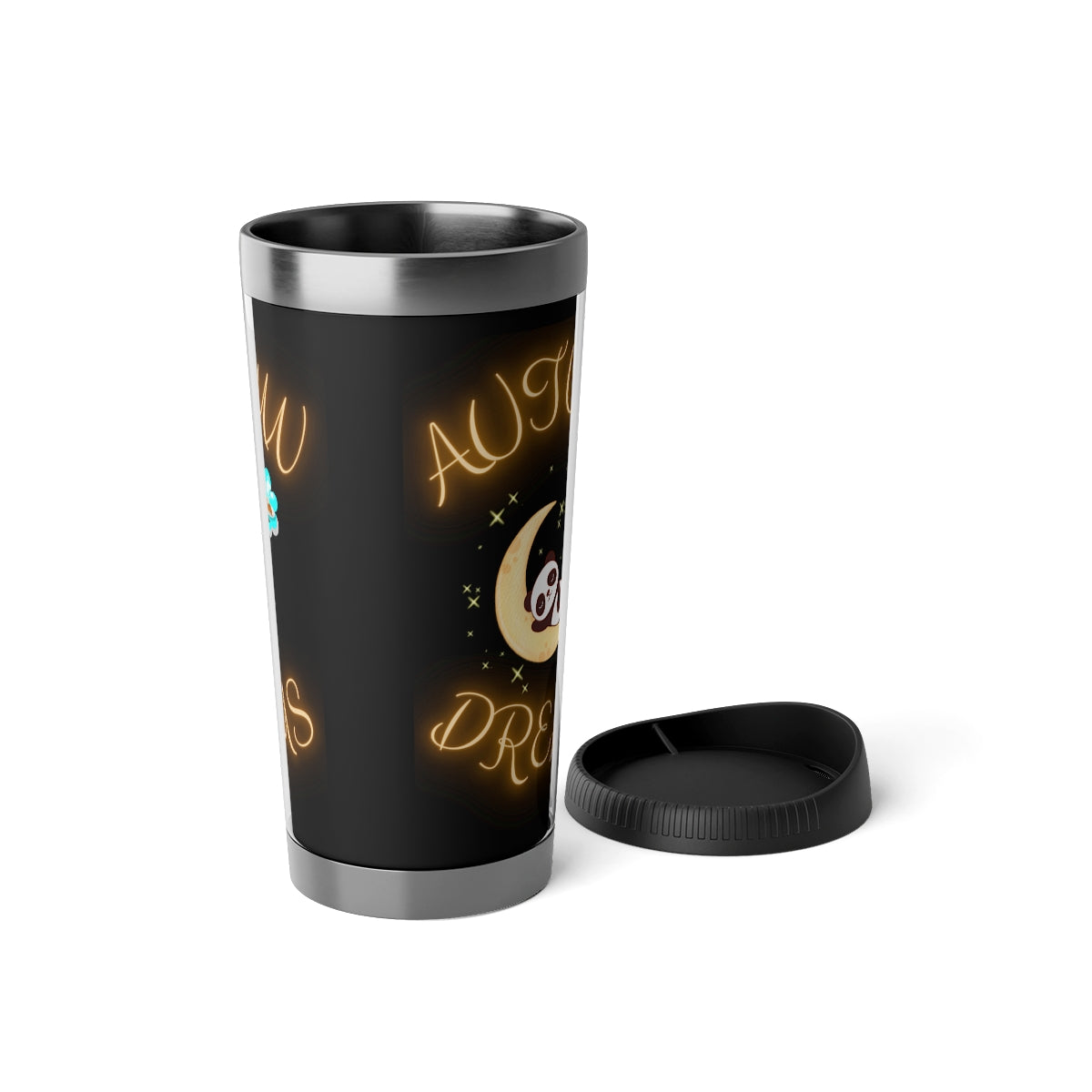 These mugs are perfect for those who love drinking their beverages on the go and want to reduce the waste produced by disposable cups. Your designs will be printed on the paper insert between the stainless steel interior and plastic exterior. They come in one size –18oz – which will hold a strong cup of joe or anything else the tastebuds desire. Secure it with the plastic lid. Hand-wash only.