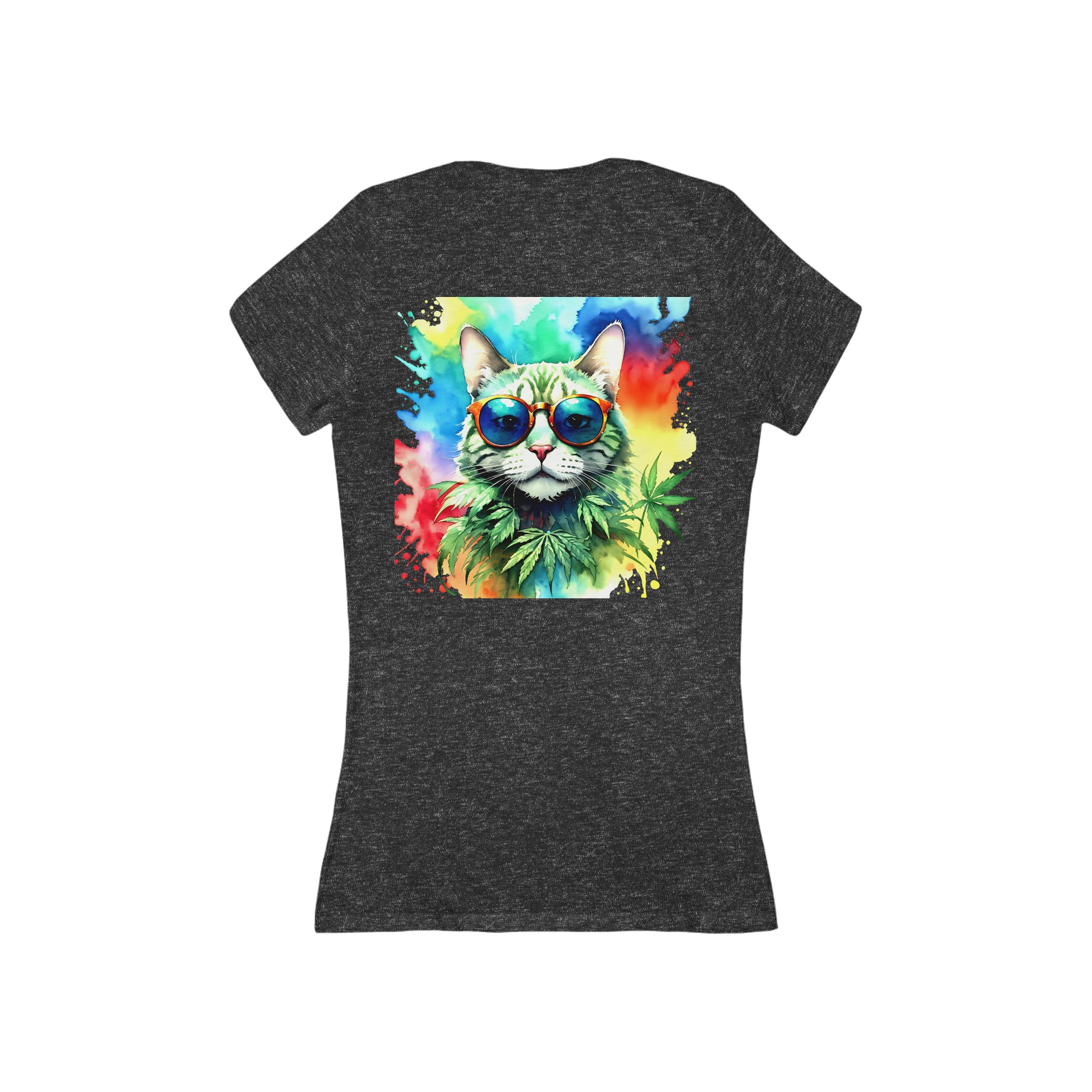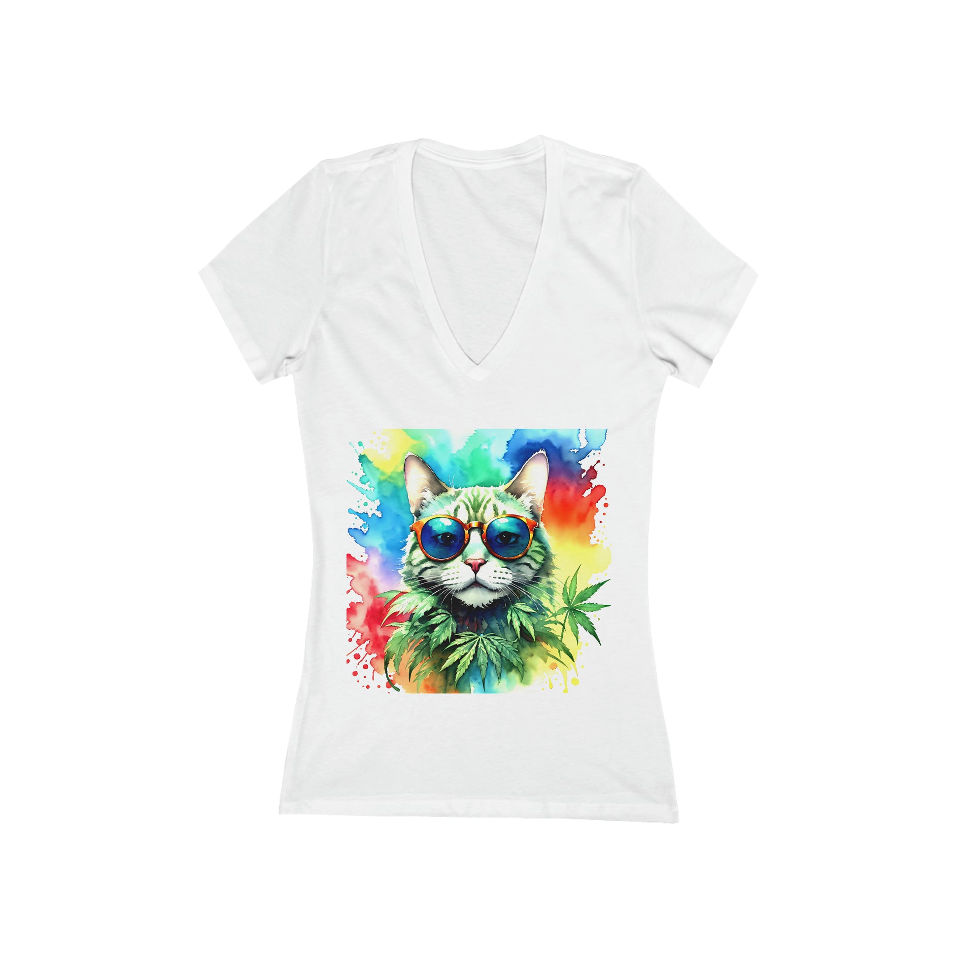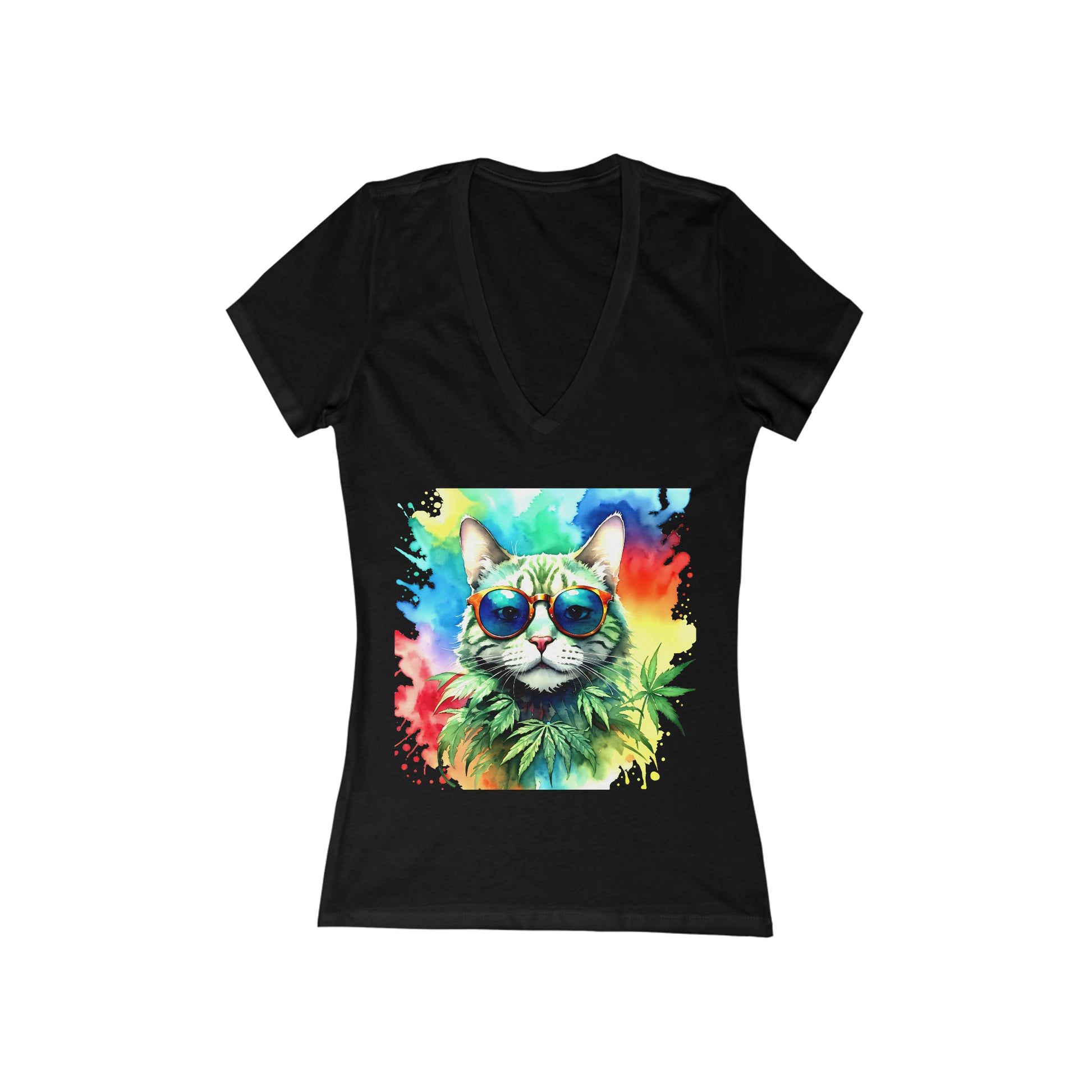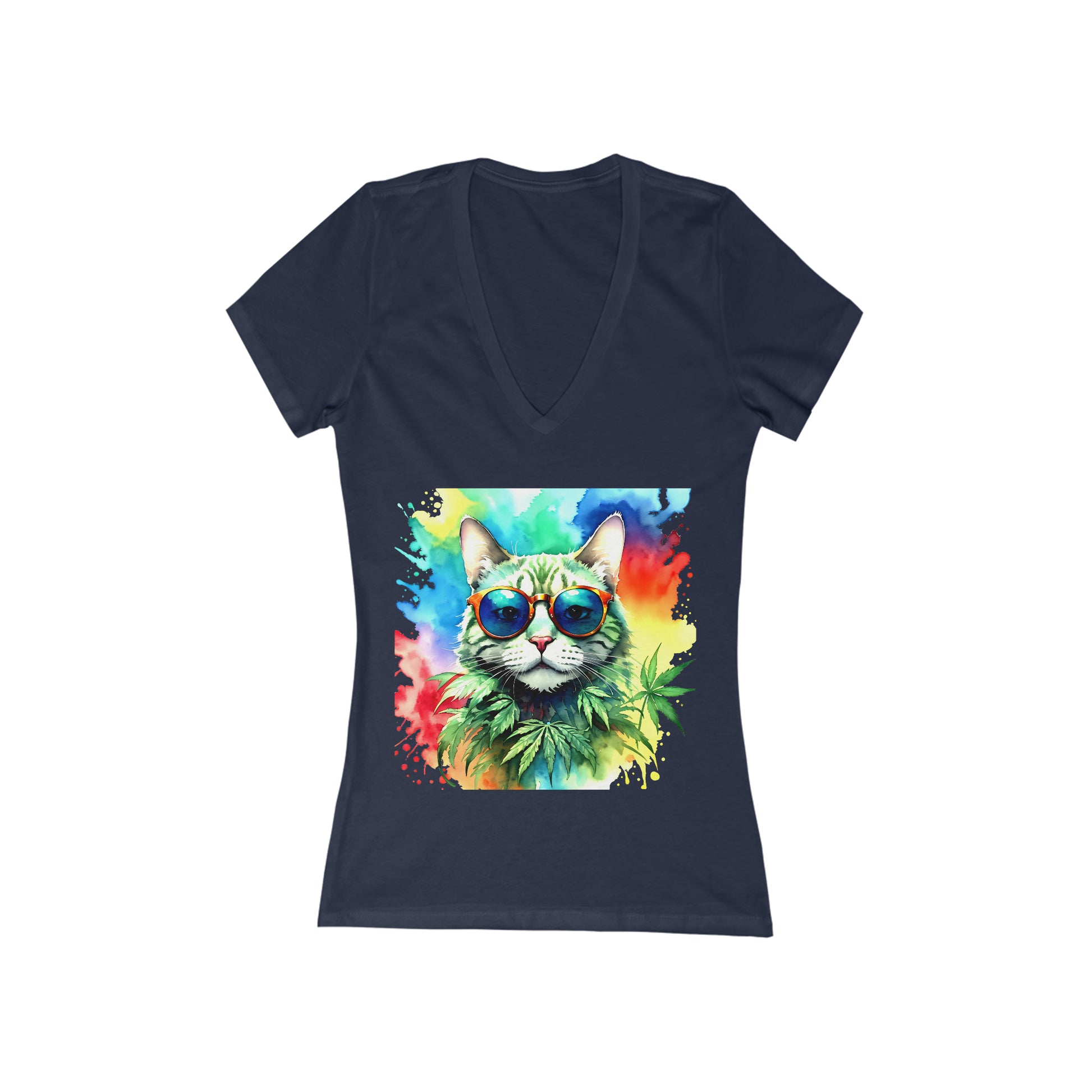 Chasing The Rainbow Cat, Women's Jersey Short Sleeve Deep V-Neck Tee