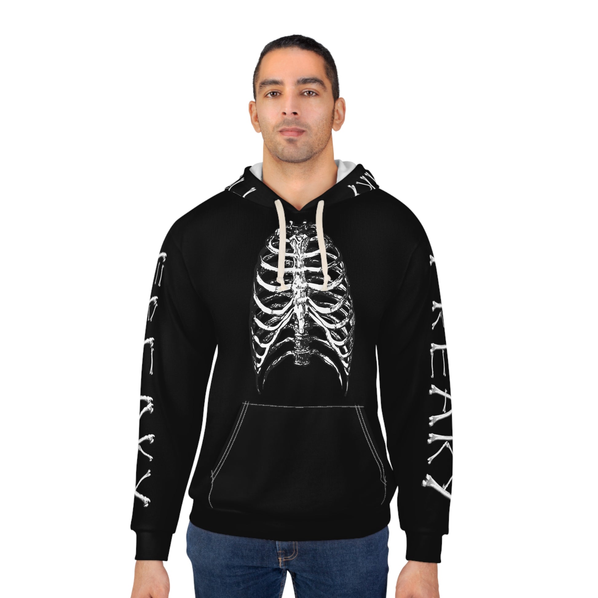 It features a large front pocket, hood with drawstring, and is custom cut and sewn.