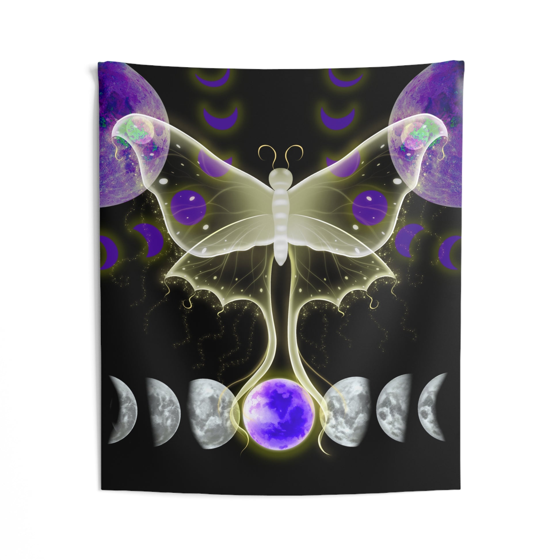 Mystic Lunar Moth, Indoor Wall Tapestries, Black Light Responsive, Moon Lover Gift