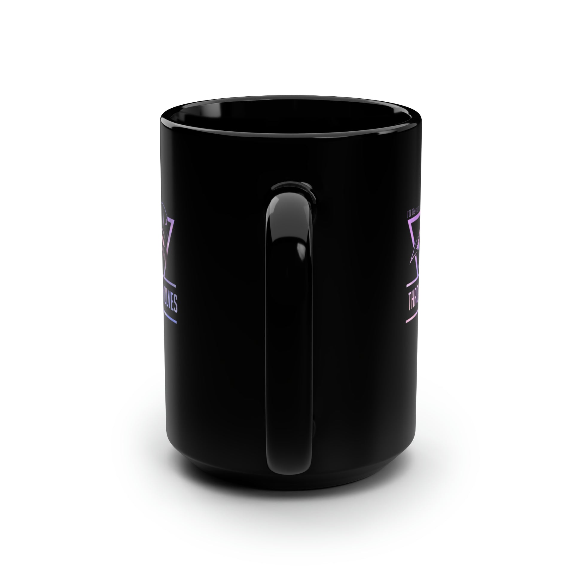 These black mugs come in one size – 15oz (0.44l) – plenty for morning caffeine boosts and hot cups of tea on a rainy day. They're easy to grip and feel sturdy thanks to the C-shaped handle. Printed on the black ceramic material in picture-perfect quality with a glossy finish.